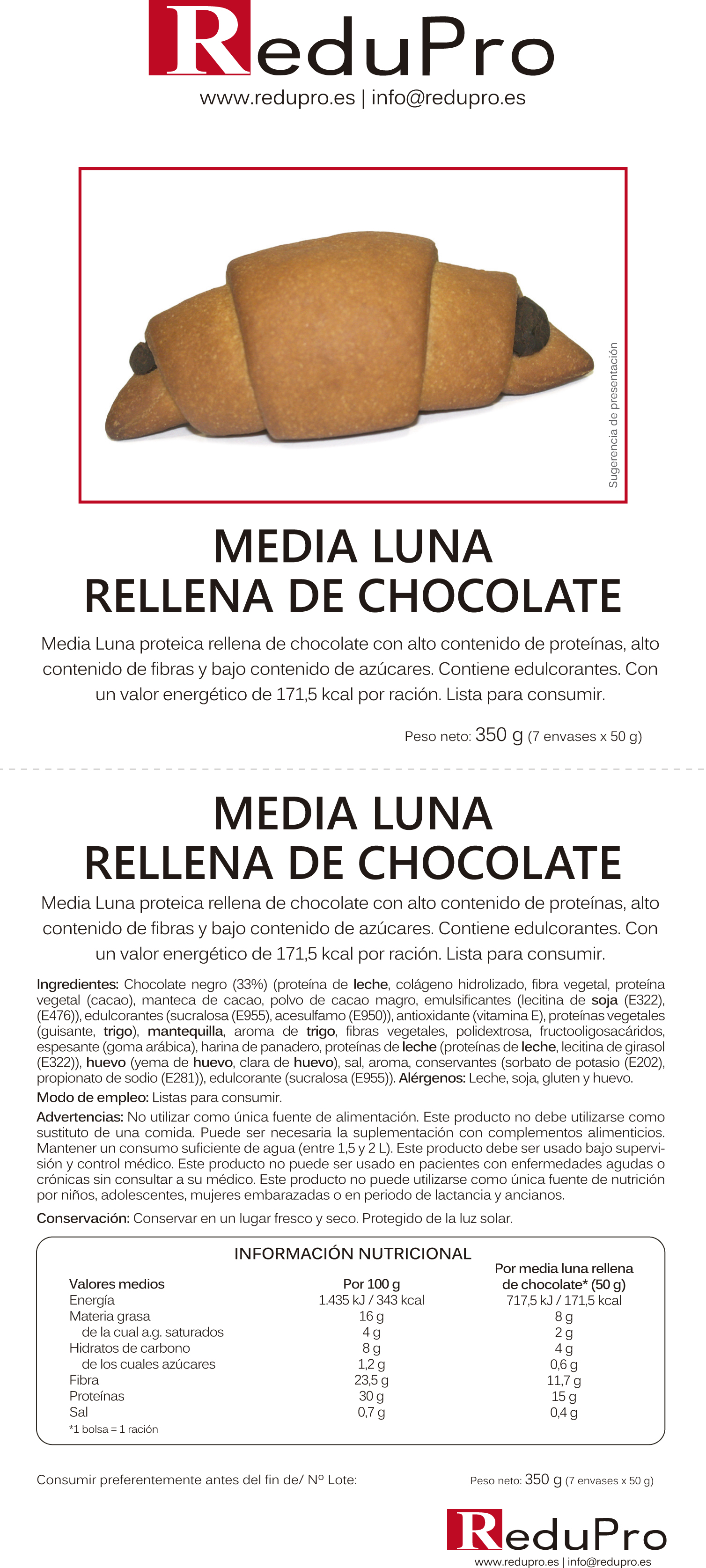 ReduPro Medias Lunas rellenas de Chocolate, caja de 7 unidades, SABOR MEJORADO